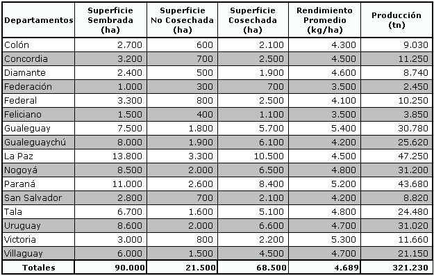 Los departamentos ubicados hacia el suroeste (Gualeguay, Victoria Y Paraná) no sufrieron situaciones tan extremas lo cual benefició al cereal.