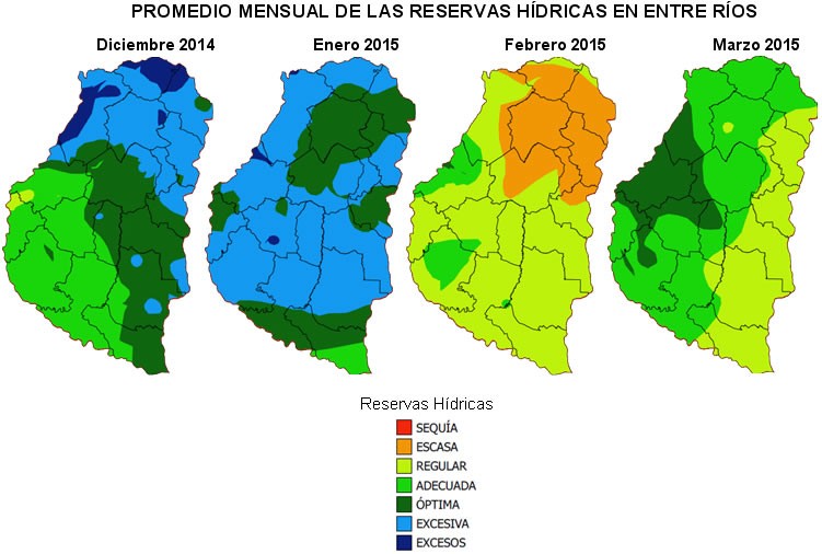 Los mapas que a continuación se presentan reflejan la situación promedio mensual de las reservas hídricas desde diciembre del 2014 a marzo del 2015.