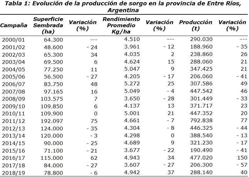 En la Tabla 1 se resume la evolución de la producción de sorgo en la provincia de Entre Ríos en los últimos 19 años.