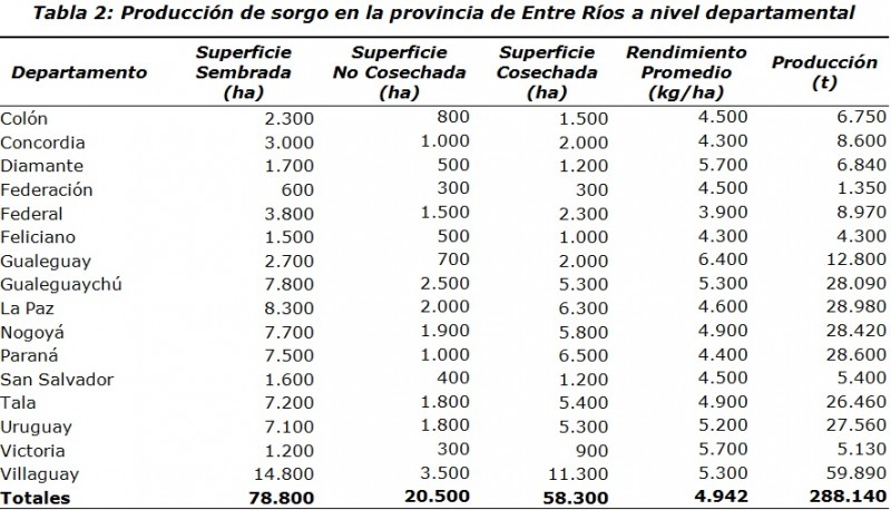 Los datos estadísticos sobre la superficie implantada con sorgo a nivel departamental se presentan en la Tabla 2.