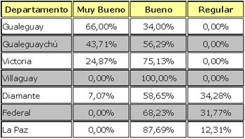 Como puedes apreciarse en el gráfico de barras, Gualeguay, Gualeguaychú, Victoria y Villaguay se ubicaron por encima del rinde promedio provincial y cuentan con Expectativas de Rendimientos entre Muy Buenas y Buenas (colores azul y verde).