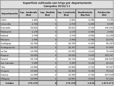 Aunque el área implantada fue levemente inferior al promedio de los últimos diez años (287.150 ha), los excelentes rendimientos obtenidos (que superan holgadamente al promedio de la década que es de 2.544 kg/ha) ha permitido que la producción de trigo entrerriana se posicione muy cercana a la de la campaña anterior que fue la máxima del período analizado, superando también en este ciclo el millón de toneladas.