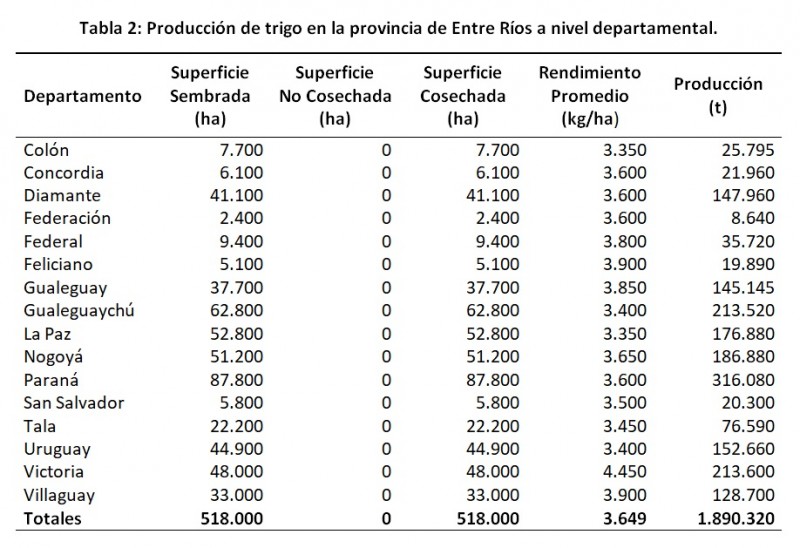 Los datos estadísticos sobre la superficie implantada con trigo a nivel departamental se presentan en la Tabla 2.