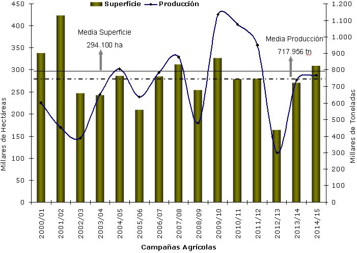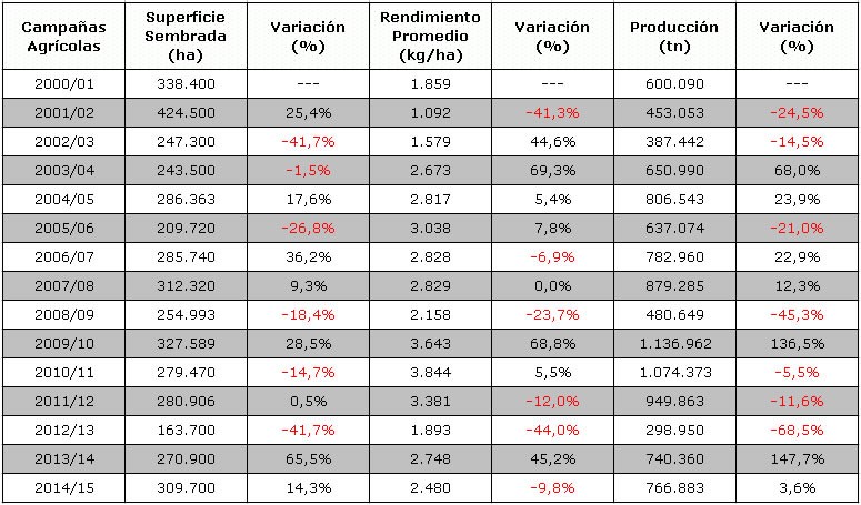 Considerando las fluctuaciones de las últimas 15 campañas agrícolas, el ciclo 2014/15 se posicionó levemente por encima del valor medio histórico, tanto en lo referente al área implantada como a las toneladas logradas.
