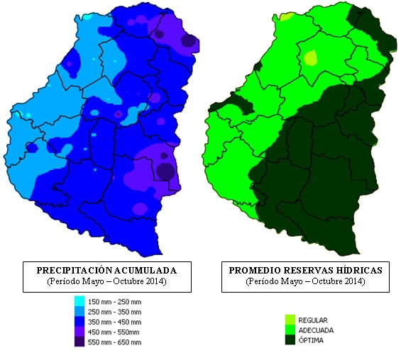 En el período vegetativo, las abundantes precipitaciones del mes de julio ocasionaron una situación de excesos hídricos en aproximadamente el 70% del área provincial; mientras que hacia fines de agosto la ausencia de lluvias generó el crecimiento de zonas con una situación de reservas regulares.