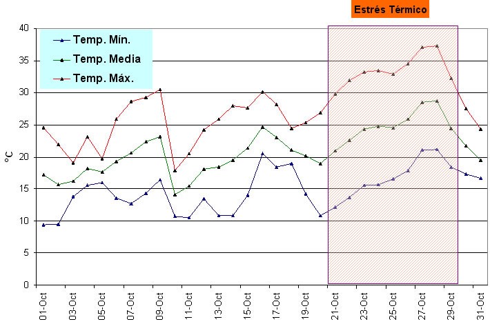 Un hecho de relevante importancia se registró entre el 21 al 29 de octubre, donde las marcas térmicas máximas se posicionaron por encima de los 30 oC, lo cual generó un escenario de estrés térmico que obviamente repercutió negativamente en los rendimientos de los lotes que se encontraban en pleno llenado de granos. En el Gráfico Nro. 3 se muestra el comportamiento térmico del mes de octubre, elaborado en base a la Red de Centrales Meteorológicas del Bolsa de Cereales de Entre Ríos.