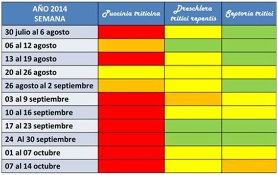 Desde setiembre en adelante, las condiciones ambientales fueron muy propicias para el desarrollo de “Roya de la hoja” (Puccinia triticina) y “Roya del tallo” (Puccinia gramini – tritici).