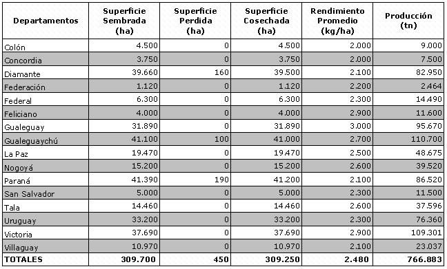 El hecho de que se implantaran materiales muy susceptibles a “Roya” y que por cuestiones financieras los productores no efectuaran tratamientos con fungicidas (fundamentalmente en los departamentos Diamante y Paraná), generó pérdidas muy significativas en los rindes e incluso la pérdida puntual de chacras que no fueron cosechadas.