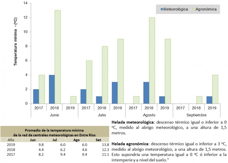 En la Figura 1 se muestra la cantidad de días con heladas meteorológicas, heladas agronómicas y el promedio de la temperatura mínima en los meses de junio a setiembre para los años 2017, 2018 y 2019. Estos valores representan el promedio obtenido de todos los sitios donde existen centrales meteorológicas.