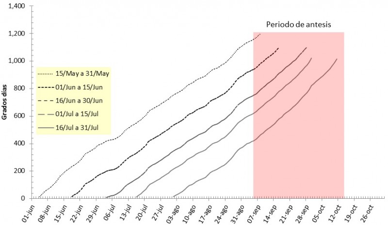 En la Figura 2 se muestra las fechas probables de antesis del trigo estimadas en base a la fecha de siembra por quincena desde el 15/mayo hasta el 31/julio. Las fechas se obtuvieron en base a la sumatoria de grados días (oCd ), con una temperatura base de crecimiento para el cultivo de 0 oC. Los oCd días requeridos para llegar a antesis para los distintos ciclos se fijó en: