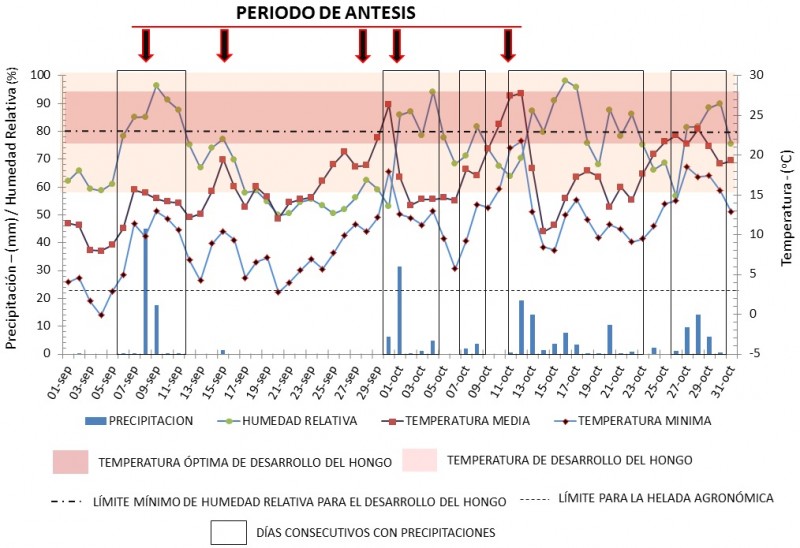 En la Figura 3 se muestran las variables climáticas (precipitación, humedad relativa, temperatura media y temperatura mínima) durante el periodo crítico del trigo (20 días de prefloración y 10 días de postfloración), donde se define del número de granos. Se indican además las fechas estimadas de antesis para cada fecha de siembra por quincena.