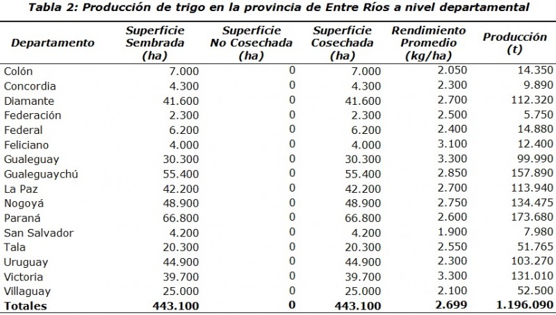 PRODUCCIÓN DE TRIGO EN LA PROVINCIA DE ENTRE RÍOS A NIVEL DEPARTAMENTAL