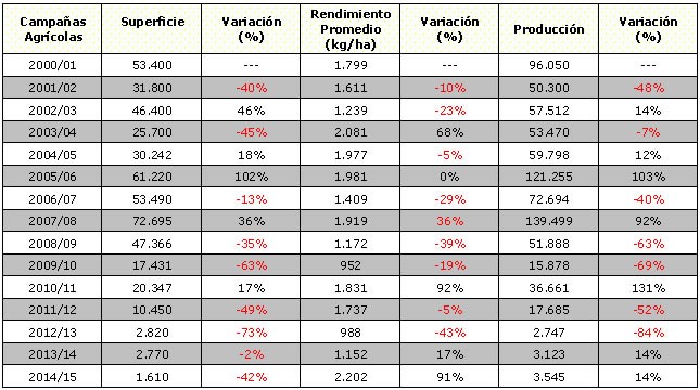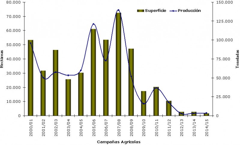 La caída registrada en las últimas 7 campañas agrícolas ha sido drástica, en el 2007/08 se implantaron en la provincia 72.695 ha (siendo el máximo detectado en los últimos 15 años); mientras que en el ciclo que acaba de finalizar apenas logró sumar una superficie de 1.610 ha. Obviamente la producción ha imitado el recorrido realizado por el área cultivada, pasando de 139.499 tn a 3.545 tn.