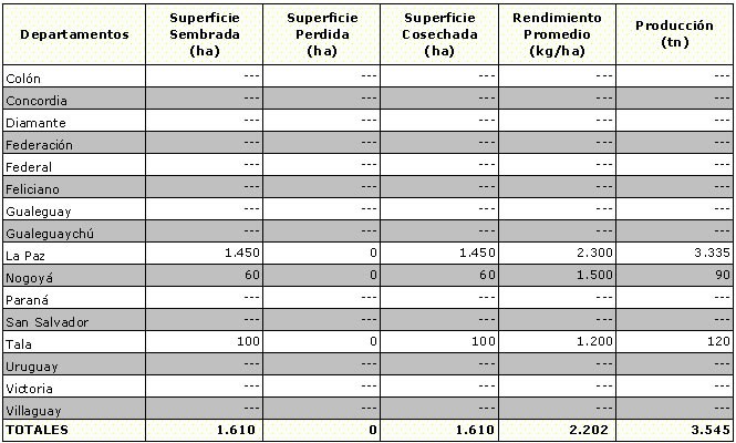 En el resto de los distritos Algarrobitos (Dpto. Tala), Pueblo 2do y Sauce Norte (Dpto. Tala) el área se posicionó por debajo de 100 ha y la producción fue inferior a 100 tn, ver Mapa Nro.1.