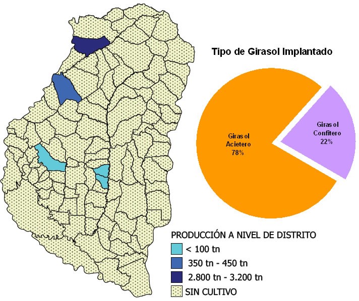 En lo referente al tipo de girasol cultivado, el 78% perteneció al tipo aceitero y el 22% restante a confitero; lográndose aproximadamente 3.200 tn (90%) del tipo aceitero y cerca de 345 tn (10%) del tipo confitero.