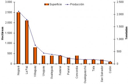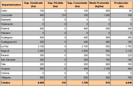 Los departamentos Nogoyá, La Paz y Villaguay concentraron aproximadamente el 70% de lo implantado y lo producido en la presente campaña, lo cual equivale a 5.400 ha y 4.670 toneladas.