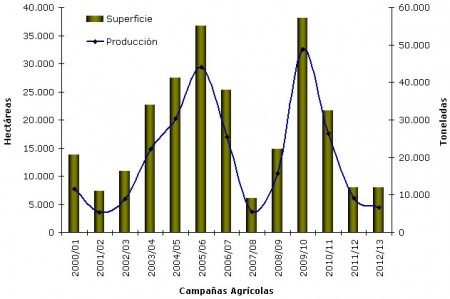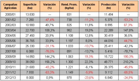 Prácticamente la superficie implantada en el ciclo agrícola actual se mantuvo estable con respecto al 2011/12 y sólo experimentó un leve incremento del 0,9 %; mientras que el rendimiento promedio y la producción total manifestaron una variación negativa de 23,6% y 24,9% respectivamente.