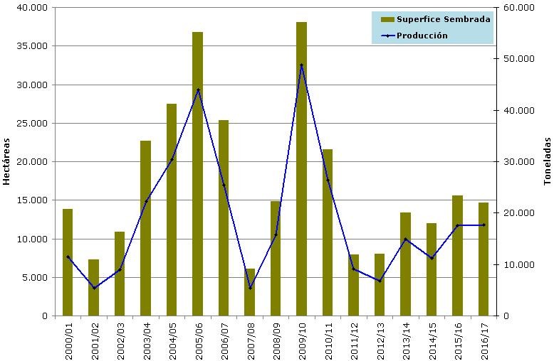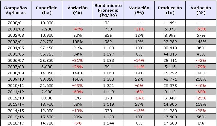 – El área implantada en la campaña 2016/17 se ubicó 16% (-2.739 ha) por debajo del promedio del período que es de 17.439 ha;