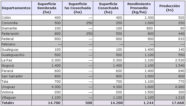 Es importante mencionar que se perdieron un total de 500 ha, ya que las reiteradas precipitaciones acaecidas desde el final de diciembre y la primera quincena de enero afectó severamente la calidad de la semilla en lotes que habían sido cortados e hilerados y por lo tanto los productores optaron por dejarlos sin trillar.