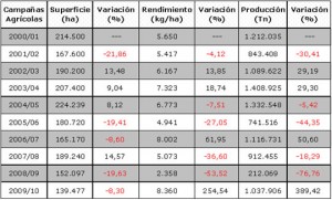 Del análisis de los datos históricos pertenecientes al SIBER se observa que el promedio de los rindes del período en estudio se sitúa en 6.006 kg/ha; mientras que la campaña 2009/10 se posicionó 2.354 kg/ha por encima del valor medio decádico.