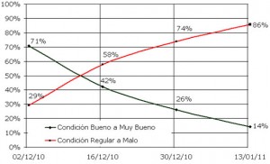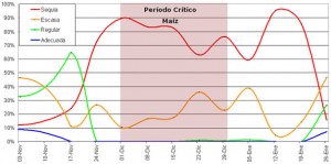 A partir de ese momento comenzó a sentirse los efectos de la falta de agua en el perfil, coincidiendo con el momento crítico para el maíz, llegando a fines de la primer quincena de enero con tan sólo el 14% en estado entre «Bueno y Muy Bueno», y el 86 % en condición «Regular a Mala».