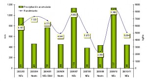 Se destaca la campaña 2009/10 (año Niño) con los máximos valores acumulados de lluvia, en donde la provincia tuvo un record de rinde promedio de 8.360 kg/ha.