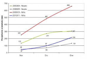 Por otra parte, el ciclo 2010/11 (año Niña) el acumulado de noviembre y diciembre fue de 97mm, mientras que el año pasado fue de 481 mm.