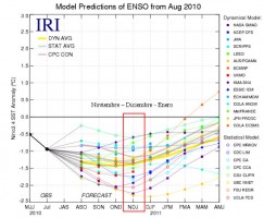 El Gráfico 1 muestra la salida de los modelos climaticos publicados el 18 de agosto del 2010 en la pagina web de la NOOA. En todos los casos se apreciaba que para el mes de diciembre las temperaturas se estimaban inferiores a las normales para el verano.