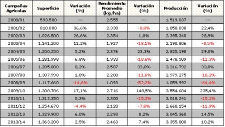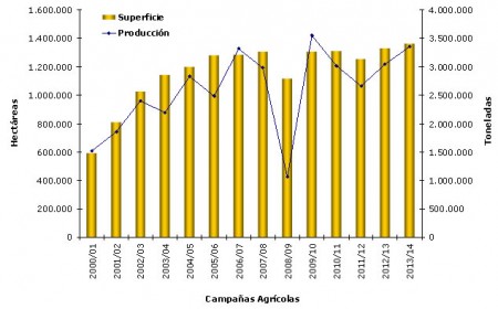 La campaña 2013/14 se posiciona como la segunda de mayor importancia si se considera las toneladas logradas, ubicada levemente por debajo del ciclo agrícola 2009/10 que tuvo una producción de 3.554.684 tn.