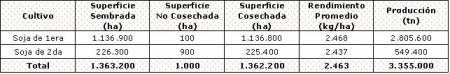 La Tabla 2 describe los parámetros productivos para la soja de 1era y 2da.
