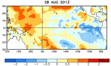 Los centros de predicciones climáticas más importantes a nivel mundial pronosticaban a inicios del mes de setiembre del 2013 un año “Neutro”; es decir que las anomalías de las temperaturas del Pacífico Ecuatorial se encontraban dentro de los parámetros normales, ver Figura 1.