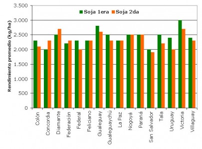 Por un lado se destaca que únicamente en Concordia, Diamante y Federación la soja de 2da superó a la de 1era; mientras que el rendimiento fue idéntico para ambas en Feliciano, La Paz, Nogoyá y Paraná.