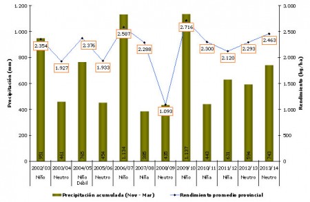 El rendimiento promedio provincial se ubicó en 2.463 kg/ha, detectándose una variación positiva de 170 kg/ha, si se la compara con lo registrado el año pasado, lo cual equivale a un crecimiento del 7,4%.