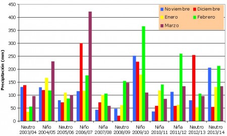 El mayor impacto se observó en el mes de febrero, ya que el monto esperado se sitúa alrededor de 160 mm y en el 2014 se registró una media de 210 mm, lo cual aportó un extra de 50 mm en la región.