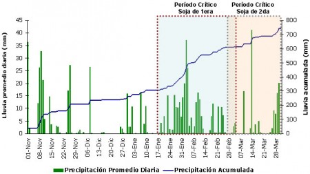 En el gráfico se ha delimitado los períodos críticos para la soja de 1era y 2da, donde puede observarse que la mayor demanda hídrica de la oleaginosa fue acompañada una mayor oferta hídrica generada por el incremento de las precipitaciones, fundamentalmente a partir de los últimos días del mes de enero.