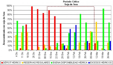 Entre fines de febrero e inicios de marzo aproximadamente el 25% del área implantada con soja de 2da tuvo déficit hídrico y ya hacia mediados de marzo casi el 100% de la superficie poseía una buena disponibilidad de agua dentro del perfil edáfico.
