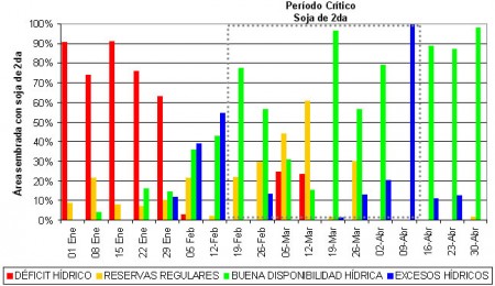 Cruzando la información geográfica proveniente de la clasificación de las imágenes satelitales y la situación de las reservas hídricas publicada semanalmente los jueves por el SIBER se diseñó el Gráfico 5, que cuantifica el porcentaje del área cultivada con soja de 2da que se encontraba dentro de las siguientes categorías: déficit hídrico, reservas regulares, buena disponibilidad hídrica y excesos hídricos entre los meses de enero y abril.