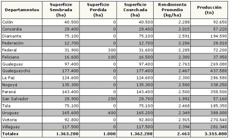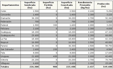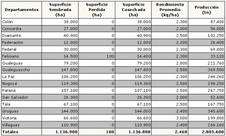 Gualeguaychú se ubica como el departamento de mayor área (177.400 ha) y producción (437.580 tn); mientras que el promedio departamental más elevado perteneció a Victoria con 2.915 kg/ha.