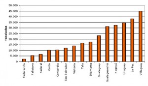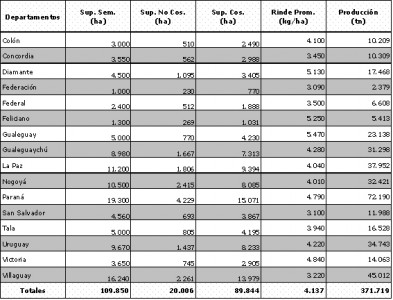 Como lo muestra el Gráfico 2, los departamentos Gualeguaychú, Nogoyá, Uruguay, La Paz, Villaguay y Paraná, son los de mayor producción ocupando el 68,2% de las toneladas totales, mientras que el otro 31,8% restante se distribuye en los demás departamentos provinciales.