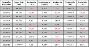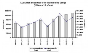 El hecho de contar con cifras propias en la última década, permitió realizar un pormenorizado análisis de lo sucedido con las tres variables productivas más importantes, el resultado del mismo indica que el área implantada con sorgo en la provincia de Entre Ríos ha tenido una variación positiva del 70,84%, mientras que la producción se incrementó un 28,16%, diferencia ésta que, más allá de los rindes obtenidos en las campañas 2004/05, 2006/07 y 2007/08, tiene su fundamento en la estabilidad de los rendimientos promedios por hectárea. Ver Grafico 1 y 2.