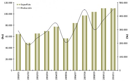 En el transcurso de los últimos once años tanto el área implantada como la producción presentaron una tendencia en alza, afirmándose con mayor énfasis en el último quinquenio.