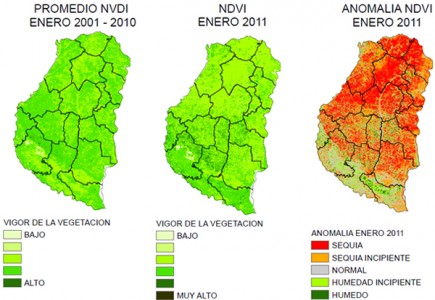 El mapa de anomalía para enero del 2011 muestra un panorama que era en general de vegetación más seca que lo normal para la época. Los tonos rojizos denotan una situación de sequía y los tonos de verde una situación más húmeda que lo normal, colocándose un color gris para una condición normal.