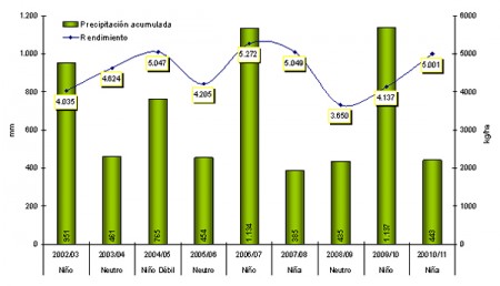 En el Gráfico 2 se presentan los rendimientos del cultivo desde la campaña 2002/03 en adelante, mencionando la situación del Pacífico Ecuatorial en los meses del verano asociados con la precipitación acumulada desde noviembre a marzo y los rindes promedios provinciales para cada campaña.