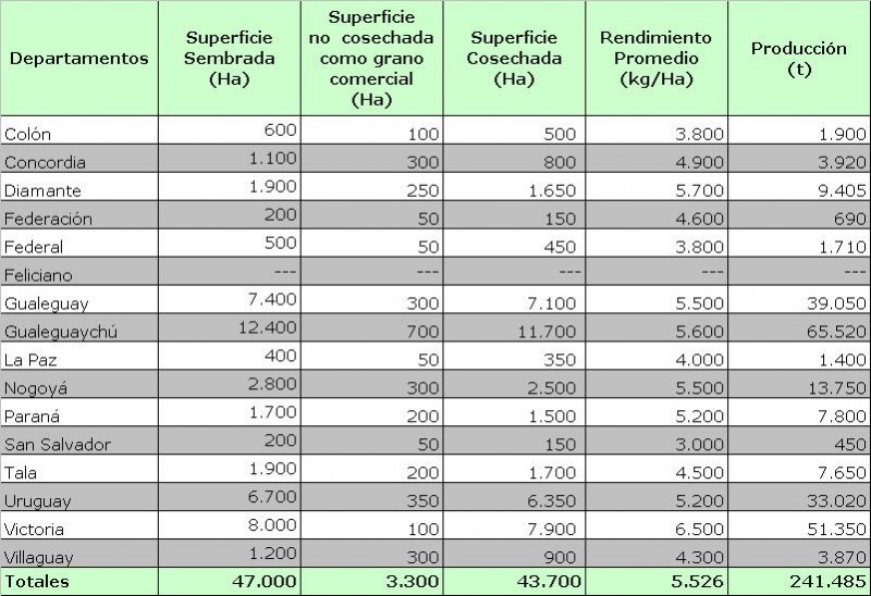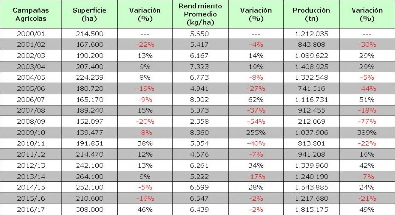 El promedio del área dedicada al maíz desde el ciclo 2000/01 hasta el 2016/17 se sitúa en 206.698 hectáreas y el promedio de lo producido en 1.107.030 toneladas. La campaña 2016/17 superó en 101.302 hectáreas y en 708.145 toneladas a los valores históricos.