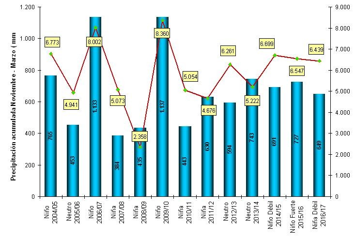 La precipitación promedio en la campaña 2016/17 fue de 649 mm, 115 mm más a lo esperado para este escenario climático; lo que tuvo una correlación positiva en el rendimiento promedio provincial con un valor de 6.439 kg/ha, es decir 562 kg/ha más a la media habitual.