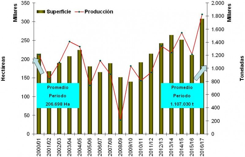 La campaña 2016/17 alcanzó la máxima superficie cultivada y de producción de los últimos 17 años (Gráfico N° 1).