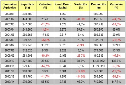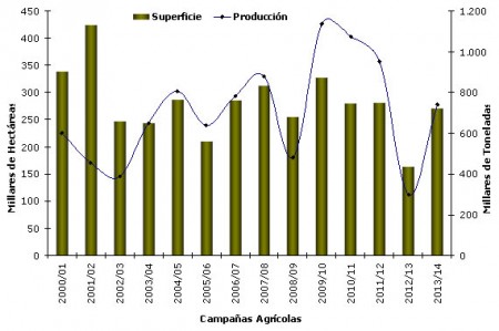 En primer lugar se detectó un crecimiento en hectáreas del 65,5%, posicionándose en 270.900 ha, cifra que superó en 107.200 ha la superficie implantada en la campaña 2012/13.