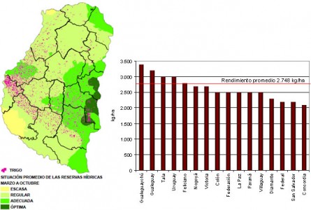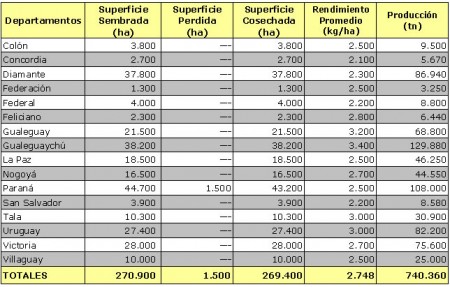 Tal como puede apreciarse, los rendimientos promedios departamentales más elevados se asocian al sector sureste que como quedó demostrado, fue el más beneficiado por las precipitaciones y este hecho le permitió a estos departamentos ubicarse por encima del rinde medio provincial que fue de 2.748 kg/ha, con la excepción del departamento Feliciano que tuvo un rinde promedio de 2.800 kg/ha, aunque cabe mencionar que la superficie implantada era de tan solo 2.300 ha.