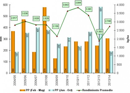 El rendimiento más bajo se produjo en el ciclo 2012/13 donde en los meses del otoño las lluvias fueron algo inferiores, pero durante el ciclo del cultivo y fundamentalmente en el período setiembre – octubre, los montos resultaron muy elevados ocasionando la aparición de enfermedades como Fusarium.