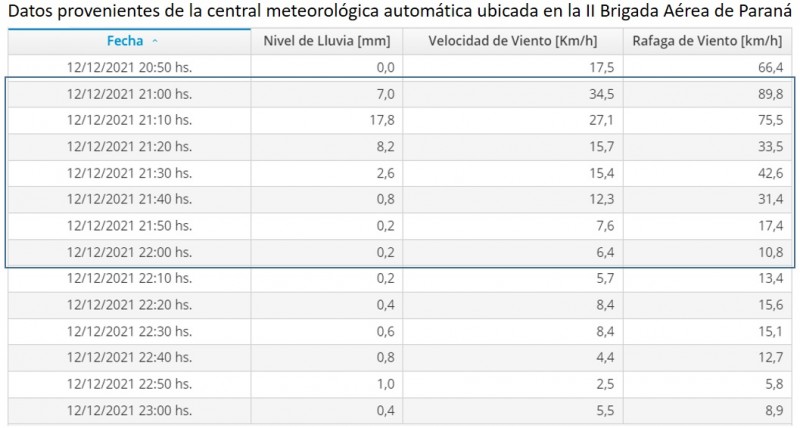 Se destaca que la precipitación inició a las 21:00 h y hubo ráfagas de viento de hasta 89,8 km/h.